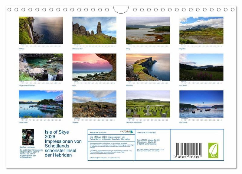 Skye, deren Namen "Insel des Nebels" bedeutet, verzaubert den Reisenden mit seiner abwechslungsreichen Landschaft. Mit ihren alten Orten, schroffen Felsen und geheimnisvollen Lochs, bis hin zur einzigartigen Küste wurde Skye zu Schottlands beliebtester Insel. Steffani Lehmann hat all dies auf wunderschönen Landschaftsbildern für ihren Kalender eingefangen.