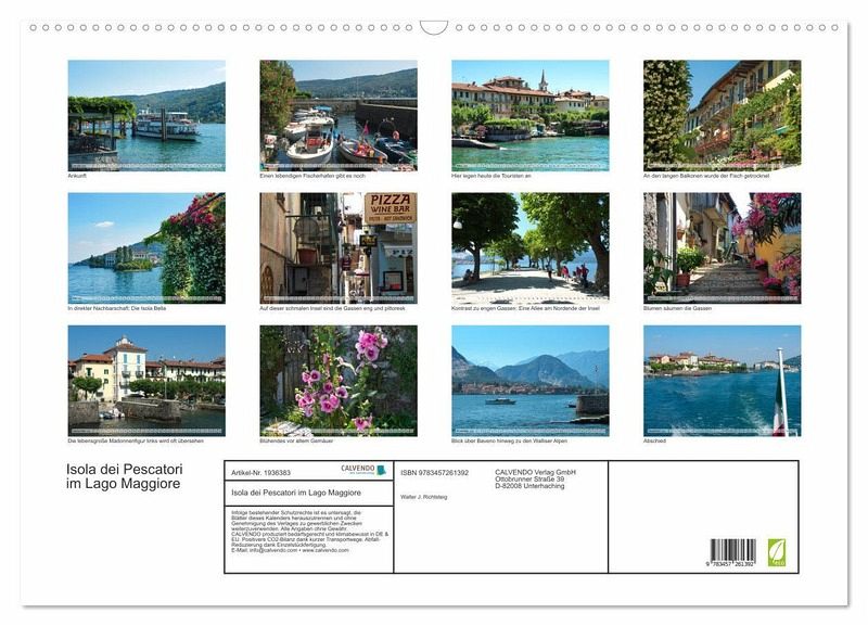 Die bekannteste der Borromäischen Inseln im Lago Maggiore ist die noble Isola Bella. Jedoch die benachbarte Isola dei Pescatori, die Fischerinsel, ist seit 600 Jahren bewohnt und hat trotz des Tourismus ihre ursprüngliche, pittoreske Ausprägung bewahrt. Der Kalender zeigt ein ganzes Jahr lang, wie malerisch diese Insel ist.