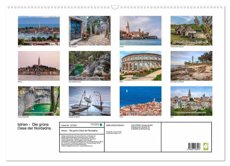 Die Halbinsel Istrien ist ein Besuchermagnet in der Nordadria. Sowohl Kroatien als auch Slowenien teilen sich belebte Strände und historische Altstädte die sich an der Küste wie eine Perlenkette aufreihen. Aber das Innere der Halbinsel birgt Überraschungen mit einsamen Schluchten und authentischen Dörfern. Mit diesem Fotokalender können sie jede Seite Istriens erleben - die raue Landschaft, der marode Charme und die Bilderbuchkulissen der beliebten Küstenstädte.