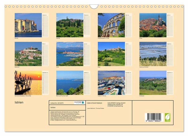 Dieser Kalender läd zu einer Entdeckungsreise auf den kroatischen und slowenischen Teil Istriens ein. Alte Städte im Hinterland, mediterrane Landschaften und eine bezaubernde Küste bringen ein Stück Urlaubsfeeling nach Hause.