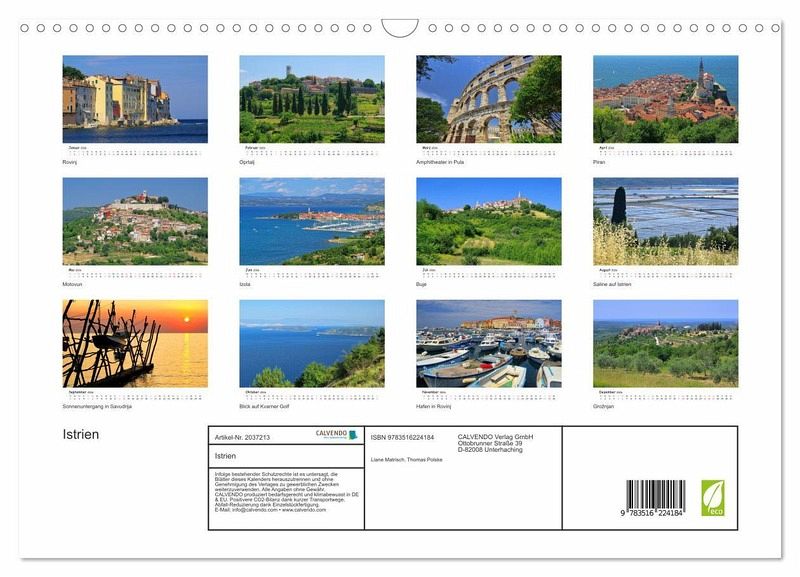 Dieser Kalender läd zu einer Entdeckungsreise auf den kroatischen und slowenischen Teil Istriens ein. Alte Städte im Hinterland, mediterrane Landschaften und eine bezaubernde Küste bringen ein Stück Urlaubsfeeling nach Hause.