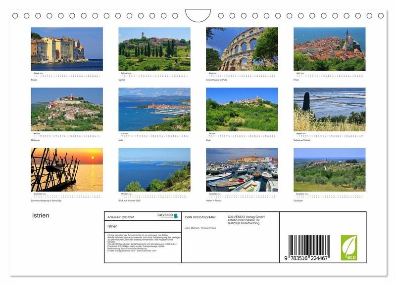 Dieser Kalender läd zu einer Entdeckungsreise auf den kroatischen und slowenischen Teil Istriens ein. Alte Städte im Hinterland, mediterrane Landschaften und eine bezaubernde Küste bringen ein Stück Urlaubsfeeling nach Hause.