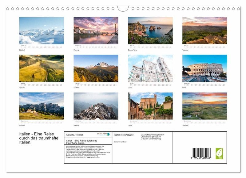 QUALITÄT - Hochwertiger Fotokalender mit 12 wunderschönen Motiven auf lichtbeständigem Bilderdruckpapier, robuste Spiralbindung mit Aufhängebügel.NACHHALTIG - deutliche Abfallreduzierung durch bedarfsgerechte Einzelstückfertigung, umweltfreundliches FSC-zertifiziertes Papier, Produktion in Deutschland, klimabewusste Logistik.PERFEKTES GESCHENK - Kalender für Freunde und Familie, für Kinder und Erwachsene, jung und alt, zu Weihnachten, Geburtstag oder zwischendurch.VIELFALT - Bildkalender in verschiedenen Formaten, z.B. DIN A5, DIN A4, DIN A3 sowie DIN A2. Ob Naturmotiv, Gemälde oder Fotos, ideal für ein persönliches Wohlfühlambiente.Eine Traumreise durch Italien. von Autor(in): Benjamin Lederer