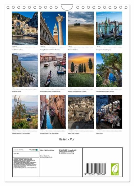 QUALITÄT - Hochwertiger Fotokalender mit 12 wunderschönen Motiven auf lichtbeständigem Bilderdruckpapier, robuste Spiralbindung mit Aufhängebügel.NACHHALTIG - deutliche Abfallreduzierung durch bedarfsgerechte Einzelstückfertigung, umweltfreundliches FSC-zertifiziertes Papier, Produktion in Deutschland, klimabewusste Logistik.PERFEKTES GESCHENK - Kalender für Freunde und Familie, für Kinder und Erwachsene, jung und alt, zu Weihnachten, Geburtstag oder zwischendurch.VIELFALT - Bildkalender in verschiedenen Formaten, z.B. DIN A5, DIN A4, DIN A3 sowie DIN A2. Ob Naturmotiv, Gemälde oder Fotos, ideal für ein persönlichesWohlfühlambiente.Italien von Venedig bis Matera in eindrucksvollen Bildern von Autor(in): Rainer Kuczinski