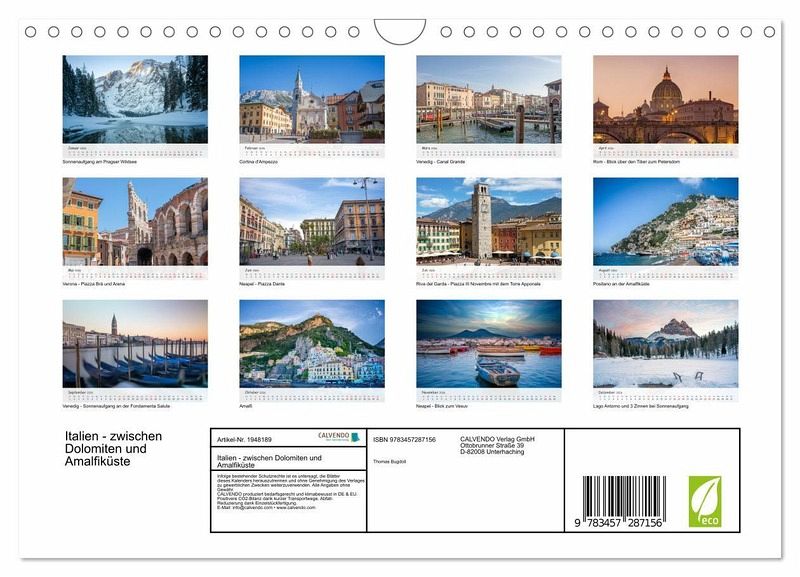 Lassen Sie sich von den faszinierenden Landschaften Italiens verzaubern! Unser exklusiver Fotokalender führt Sie auf eine visuelle Reise von den majestätischen Dolomiten im Norden bis zur traumhaften Amalfiküste im Süden. Jeder Monat präsentiert atemberaubende Aufnahmen, die die einzigartige Schönheit dieses vielseitigen Landes einfangen - von schneebedeckten Gipfeln bis hin zu malerischen Küsten und historischen Städten.