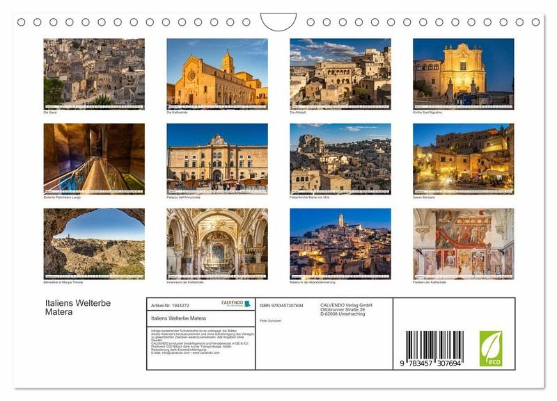 Tauchen Sie ein in die faszinierende Welt von Matera mit diesem Fotokalender vom renommierten Reisefotografen Peter Schickert! Dieser Kalender zeigt die beeindruckende Schönheit der jahrtausendealten Felsenstadt in Süditalien, die für ihre "Sassi" - die in Stein gehauenen Häuser - weltberühmt ist.