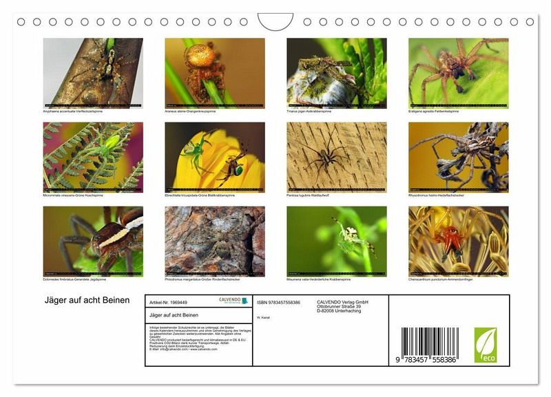 QUALITÄT - Hochwertiger Fotokalender mit 12 wunderschönen Motiven auf lichtbeständigem Bilderdruckpapier, robuste Spiralbindung mit Aufhängebügel.NACHHALTIG - deutliche Abfallreduzierung durch bedarfsgerechte Einzelstückfertigung, umweltfreundliches FSC-zertifiziertes Papier, Produktion in Deutschland, klimabewusste Logistik.PERFEKTES GESCHENK - Kalender für Freunde und Familie, für Kinder und Erwachsene, jung und alt, zu Weihnachten, Geburtstag oder zwischendurch.VIELFALT - Bildkalender in verschiedenen Formaten, z.B. DIN A5, DIN A4, DIN A3 sowie DIN A2. Ob Naturmotiv, Gemälde oder Fotos, ideal für ein persönliches Wohlfühlambiente.Heimische Spinnen hautnah fotografiert von Autor(in): Wolfgang Kairat