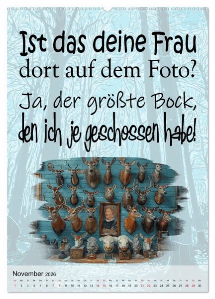 Entdecken Sie den humorvollen Jagd- und Jägerkalender! Jeden Monat ein Lächeln auf den Lippen mit witzigen Sprüchen und beeindruckenden, KI-generierten Bildern. Perfekt als Geschenk für alle Jägerinnen und Jäger oder als Blickfang in der eigenen Wohnung. Sichern Sie sich jetzt Ihren Kalender und erleben Sie jeden Monat eine neue, humorvolle Seite der Jagd!