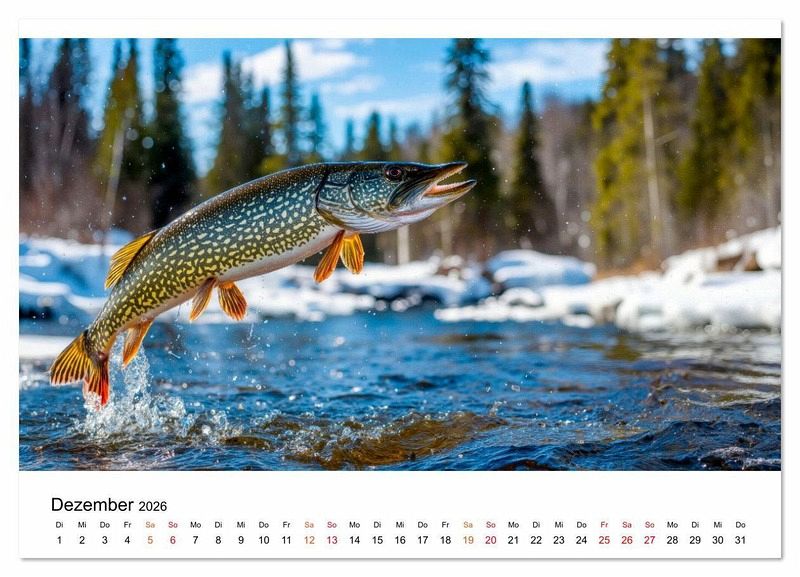 Juni: Ein majestätischer Hecht, der durchs klare Wasser gleitet,