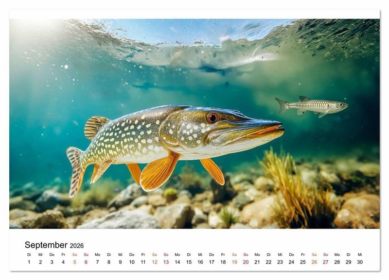 Juni: Ein majestätischer Hecht, der durchs klare Wasser gleitet,