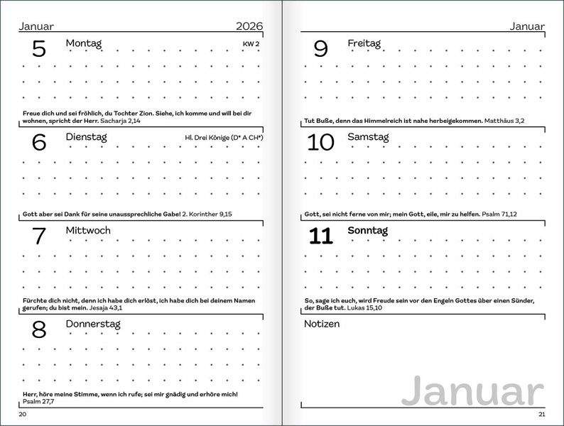 Notice: ein Terminkalender, der durch Dick und Dünn mitgehtDer tägliche Begleiter im Notice-Format.Mit ausgelosten Bibelversen für jeden Tag und viel Platz für Eintragungen.Notice: der Termin-Kalender mit dem Foto-Jahreslosungs-Motiv:- Format Groß (Notice): 9 x 14 cm- je eine Doppelseite pro Woche- 192 Seiten, gebunden, mit Lesebändchen und GummiverschlussErgänzen Sie diesen Kalender durch die praktische Stiftschlaufe RKW 99070 (EAn 4034905990704) zum Ankleben. So haben Sie Ihren Stift für Eintragungen immer zur Hand.Gott spricht: Siehe, ich mache alles neu!Offenbarung 21,5 (Jahreslosung 2026)
