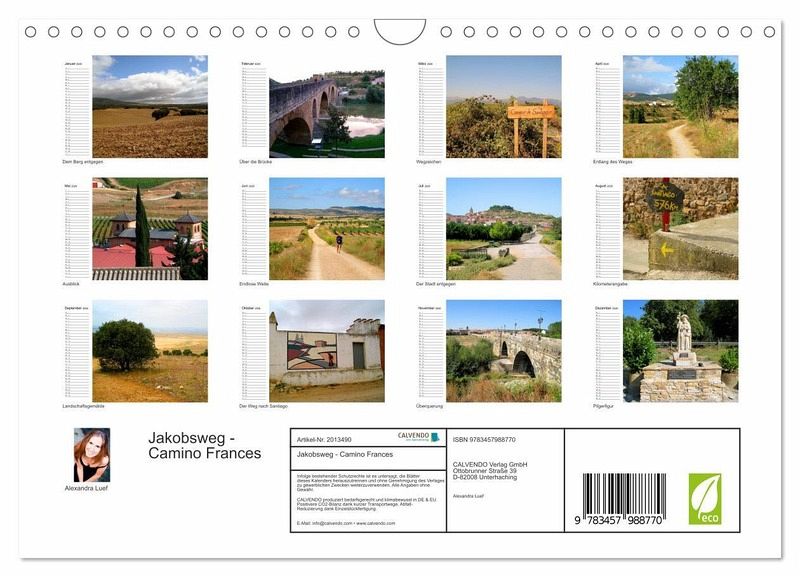 QUALITÄT - Hochwertiger Fotokalender mit 12 wunderschönen Motiven auf lichtbeständigem Bilderdruckpapier, robuste Spiralbindung mit Aufhängebügel.NACHHALTIG - deutliche Abfallreduzierung durch bedarfsgerechte Einzelstückfertigung, umweltfreundliches FSC-zertifiziertes Papier, Produktion in Deutschland, klimabewusste Logistik.PERFEKTES GESCHENK - Kalender für Freunde und Familie, für Kinder und Erwachsene, jung und alt, zu Weihnachten, Geburtstag oder zwischendurch.VIELFALT - Bildkalender in verschiedenen Formaten, z.B. DIN A5, DIN A4, DIN A3 sowie DIN A2. Ob Naturmotiv, Gemälde oder Fotos, ideal für ein persönliches Wohlfühlambiente.Unterwegs am Jakobsweg von St. Jean-Pied-de-Port nach Santiago de Compostela von Autor(in): Alexandra Luef