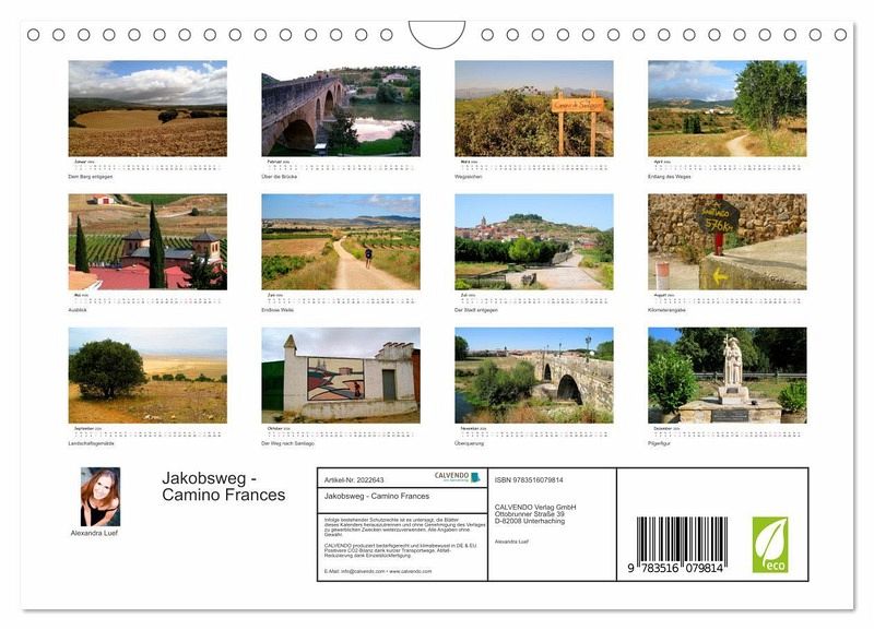 QUALITÄT - Hochwertiger Fotokalender mit 12 wunderschönen Motiven auf lichtbeständigem Bilderdruckpapier, robuste Spiralbindung mit Aufhängebügel.NACHHALTIG - deutliche Abfallreduzierung durch bedarfsgerechte Einzelstückfertigung, umweltfreundliches FSC-zertifiziertes Papier, Produktion in Deutschland, klimabewusste Logistik.PERFEKTES GESCHENK - Kalender für Freunde und Familie, für Kinder und Erwachsene, jung und alt, zu Weihnachten, Geburtstag oder zwischendurch.VIELFALT - Bildkalender in verschiedenen Formaten, z.B. DIN A5, DIN A4, DIN A3 sowie DIN A2. Ob Naturmotiv, Gemälde oder Fotos, ideal für ein persönliches Wohlfühlambiente.Unterwegs am Jakobsweg von St. Jean-Pied-de-Port nach Santiago de Compostela von Autor(in): Alexandra Luef