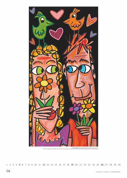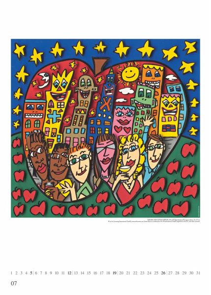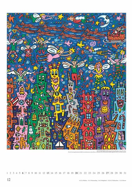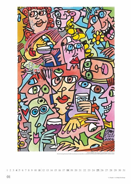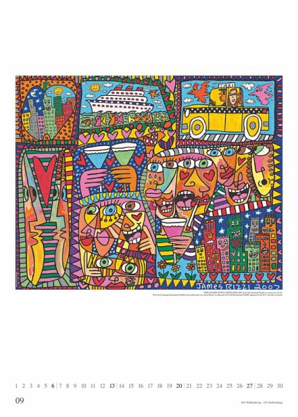 Dieser Poster-Kalender hält zwölf seiner poppigen Motive für Sie bereit. Tauchen Sie ein in die farbenfrohe und heitere Welt des James Rizzi! Lassen Sie sich Monat für Monat von neuen prächtigen Kunstdrucken begeistern!