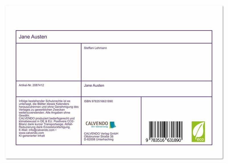 Tauchen Sie ein in das Leben und Werk der weltberühmten Autorin Jane Austen! Dieser liebevoll gestaltete Kalender vereint sechs eindrucksvolle biografische Motive mit sechs stimmungsvollen Szenen aus ihren Klassikern wie "Stolz und Vorurteil" und "Emma". Jedes Bild, das Steffani Lehmann mit Unterstützung einer KI editiert hat, fängt im warmen, realistischen Stil die Eleganz und den Zeitgeist der Regency-Ära authentisch ein.