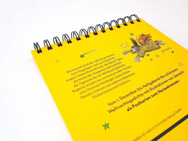 Mit wem könnte es im Advent lustiger zugehen als mit Janosch? Auf 24 Postkarten sorgen Günter Kastenfrosch, der kleine Tiger und natürlich die Tigerente für ein weihnachtliches Schmunzeln, wenn sie auf die heiteren Verse von Christine Nöstlinger, James Krüss, Theodor Fontane und anderen bekannten Dichterinnen und Dichtern treffen.