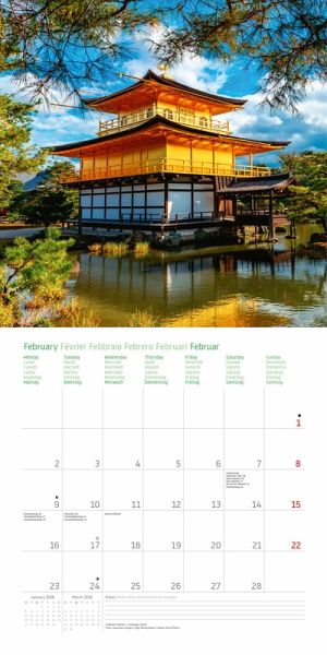 Der Japan Broschürenkalender 2026 aus der Reihe 1000 Places to See Before You Die lädt Sie auf eine visuelle Reise durch das faszinierende Land der aufgehenden Sonne ein - von traditionellen Tempeln über blühende Kirschgärten bis zu modernen Metropolen. Jeden Monat erwarten Sie beeindruckende Panoramaaufnahmen kombiniert mit Raum für Ihre Termine und Notizen. Im geschlossenen Format misst der Kalender 30 × 30 cm, aufgeklappt entfaltet er sich zu 30 × 60 cm für volle Bildwirkung.Highlights:Faszinierende Japan-Motive: Jeden Monat ein ausgewähltes Panorama aus Natur, Kultur & ArchitekturPraktisches Format: 30 × 30 cm (geschlossen) - ideal zum Aufhängen und DekorierenGroßes Bildformat geöffnet: 30 × 60 cm - optimale Darstellung der MotiveNotizkalendarium integriert: Viel Platz für Ihre Termine, Gedanken & PlanungenFerien & Feiertage D/A/CH: Inklusive Kalendarium für Ihre ReiseplanungJahresübersichten & Extras: Nützliche Übersichten für langfristige OrientierungDer 1000 Places - JapanBroschürenkalender 2026 ist mehr als ein Wandkalender: Er verbindet visuelle Faszination, praktische Funktion und Reiselust in einem stilvollen Begleiter für das ganze Jahr.
