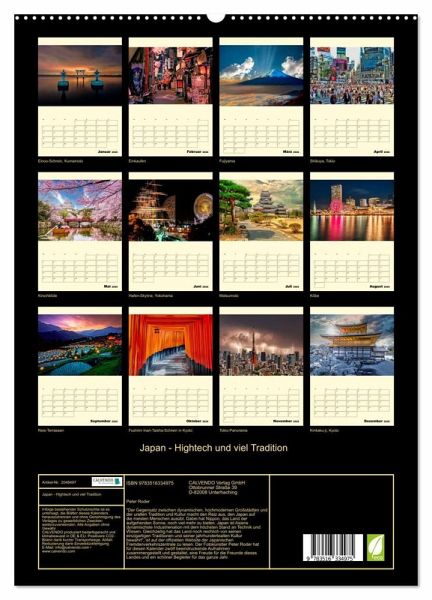 "Der Gegensatz zwischen dynamischen, hochmodernen Großstädten und der uralten Tradition und Kultur macht den Reiz aus, den Japan auf die meisten Menschen ausübt. Dabei hat Nippon, das Land der aufgehenden Sonne, noch viel mehr zu bieten. Japan ist Asiens dynamischste Industrienation mit dem höchsten Stand an Technik und Wissen. Gleichzeitig hat das Land noch reichlich von seinen einzigartigen Traditionen und seiner jahrhundertealten Kultur bewahrt", ist auf der offiziellen Website der Japanischen Fremdenverkehrszentrale zu lesen. Der Fotokünstler Peter Roder hat für diesen Kalender zwölf beeindruckende Aufnahmen zusammengestellt und gestaltet, eine Freude für die Freunde dieses Landes und ein schöner Begleiter für das ganze Jahr.