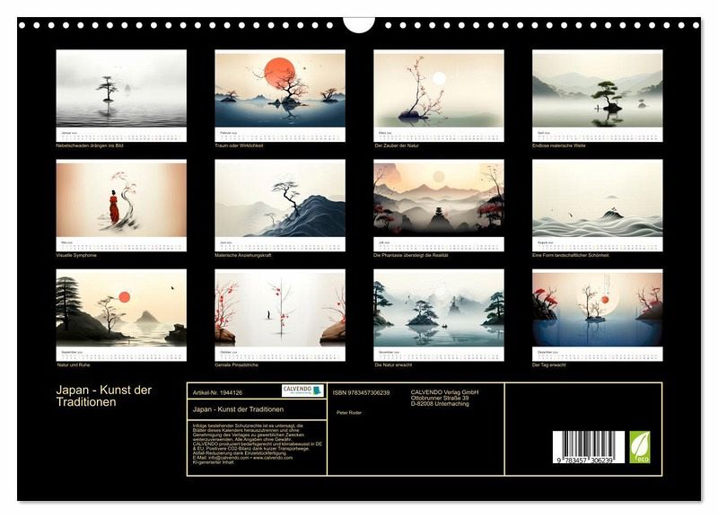 Lassen Sie sich überraschen von diesen wahrhaft bezaubernden KI-Bildern, die die traditionelle japanische Kunst mit minimalistischen Pinselstrichen präsentieren. Jeder Monat zeigt ein atemberaubendes Kunstwerk, das die Essenz der Natur in ihrer reinsten Form einfängt - von nebligen Bergen bis hin zu zarten Bäumen und anmutigen Frauen. Diese Bildmotive spiegeln das empfindliche Gleichgewicht zwischen Einfachheit und Komplexität wider, das für die japanische Ästhetik so wichtig ist. Dieser Kalender ist perfekt für alle Kunst-, Kultur- und Naturliebhaber und bringt ein Gefühl von Frieden und zeitloser Schönheit in Ihr Zuhause oder Büro.