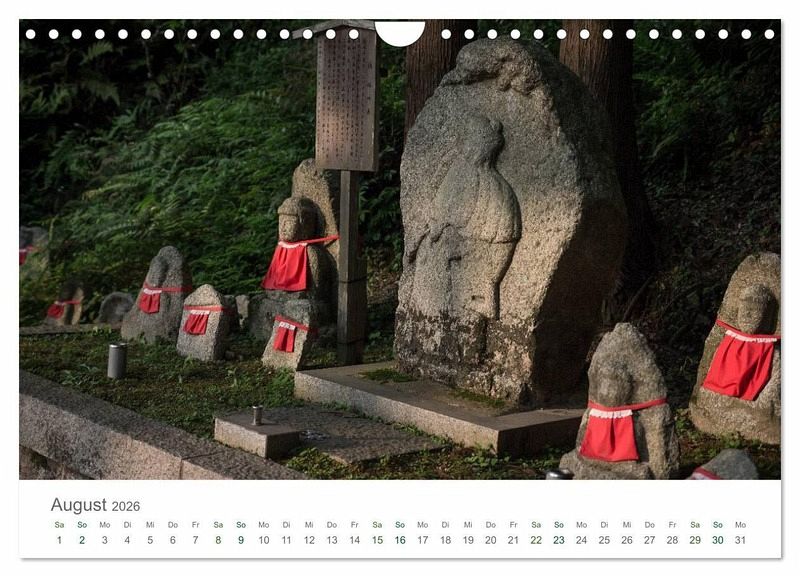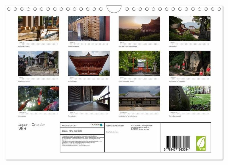 Gehen Sie mit diesem Kalender auf eine visuelle Reise durch die diversen stillen und besinnlichen Orte Japans. Finden Sie etwas Ruhe in Ihrem hektischen Alltag durch die beruhigen Motive der verschiedenen Tempel, Orte und der japanischen Natur.