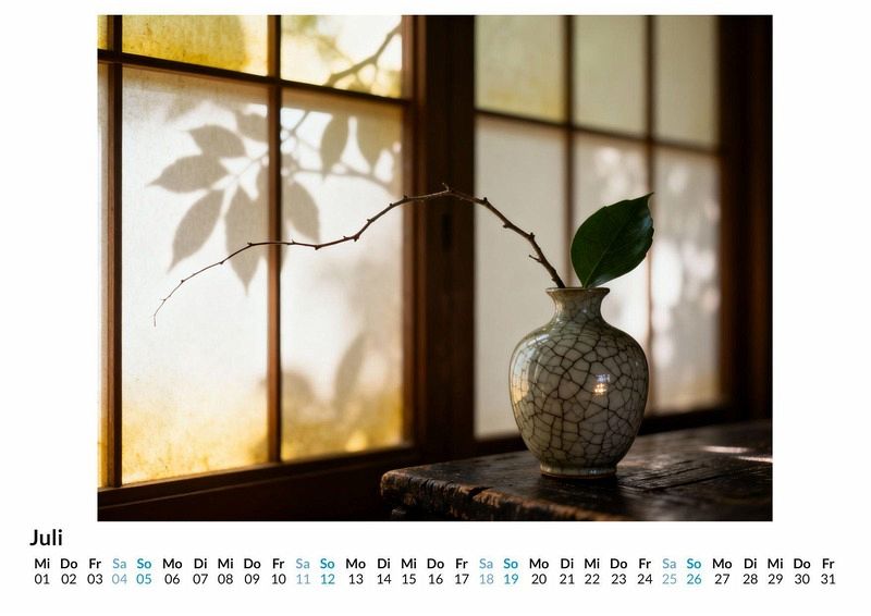Einleitung In einer Welt, die nach Perfektion strebt, liegt eine besondere Ruhe in der Akzeptanz des Vergänglichen. Der Kalender "Japanische Ästhetik (Wabi-Sabi)" fängt genau diese Essenz ein. Er zelebriert die stille Schönheit, die in Asymmetrie, Einfachheit und den Spuren der Zeit verborgen liegt. Dieser Kalender ist eine Bereicherung für: * Liebhaber minimalistischer Gestaltung und klarer Formen. * Menschen, die Inspiration in der japanischen Philosophie und Kunst suchen. * Alle, die einen Ort der Ruhe und Besinnung in ihrem Alltag schaffen möchten. Kurzer beschreibender Text Jeder Monat enthüllt ein sorgfältig arrangiertes Stillleben. Raue Keramik trifft auf zarte Zweige, das Spiel von Licht und Schatten betont die Textur von getrockneten Blättern und schlichten Gefäßen. Die Motive, inspiriert von traditionellem Ikebana und der Ästhetik des Unvollkommenen, wurden von einer kreativen Rechenlogik komponiert, um eine Brücke zwischen alter Tradition und neuen Ausdrucksformen zu schlagen. Was dieser Kalender bietet: * Zwölf Monatsblätter mit Motiven, die die Prinzipien von Wabi Sabi widerspiegeln. * Eine Sammlung von Stillleben, die Ruhe und Konzentration ausstrahlen. * Ein Kalendarium, das sich dezent in das Gesamtbild einfügt. Zusammenfassung und motivierende Aufforderung Der Kalender "Japanische Ästhetik (Wabi-Sabi)" ist mehr als ein Zeitplaner; er ist eine monatliche Einladung, die Schönheit im Einfachen und Unvollkommenen zu entdecken. Er begleitet durch das Jahr mit Bildern, die zum Innehalten anregen. Entdecken Sie die zwölf Kompositionen, die diese besondere Philosophie zum Leben erwecken.