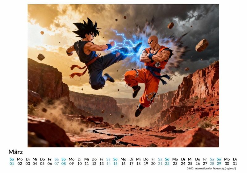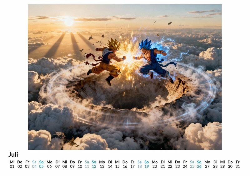 Japanische Anime-Kampfkunst Energiegeladene Kämpfe, die den Himmel erbeben lassen, und legendäre Krieger, deren Kraft das Universum formt. Der Kalender "Japanische Anime-Kampfkunst" fängt die Essenz epischer Auseinandersetzungen ein, die an eine der berühmtesten Sagas der Anime-Geschichte erinnern. Jeder Monat enthüllt eine neue Szene, die von der unbändigen Energie und dem unerschütterlichen Willen der Charaktere erzählt. Dieser Kalender ist eine ideale Ergänzung für: * Liebhaber von Sh¿nen-Anime und Manga. * Sammler von Kunstwerken, die von klassischen japanischen Zeichentrickserien inspiriert sind. * Alle, die ihre Wände mit Motiven voller Bewegung und Energie schmücken möchten. Zwölf Monate lang begleiten den Betrachter Szenen voller Spannung und dramatischer Posen. Die Motive wurden nicht gezeichnet, sondern durch komplexe Rechenprozesse zum Leben erweckt, die den unverwechselbaren Stil der Vorlage interpretieren und neu zusammensetzen. Jedes Bild konzentriert sich auf den entscheidenden Moment eines Kampfes: geballte Energie, entschlossene Blicke und die pure Kraft, die von den Charakteren in ihrer Umgebung freigesetzt wird. Was der Kalender bietet: * Zwölf dynamische Motive im Anime-Kampfkunst-Stil. * Ein praktischer Wandkalender für das ganze Jahr. * Ein monatlicher Blickfang für jeden Raum. Dieser Kalender ist eine Hommage an die unvergesslichen Duelle, die Generationen von Fans geprägt haben. Ein Jahr voller legendärer Konfrontationen wartet darauf, entdeckt zu werden.