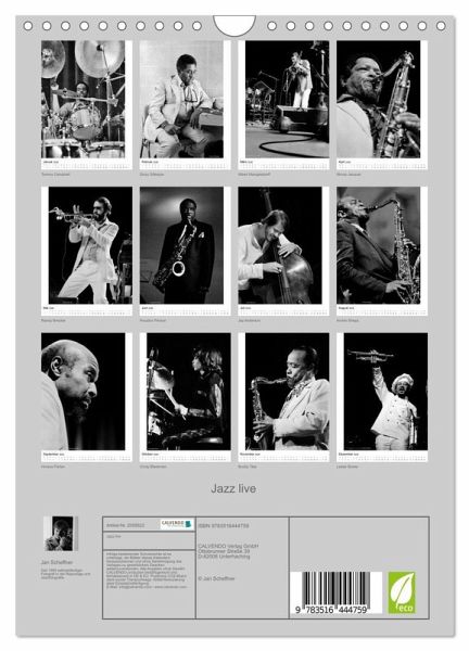 QUALITÄT - Hochwertiger Fotokalender mit 12 wunderschönen Motiven auf lichtbeständigem Bilderdruckpapier, robuste Spiralbindung mit Aufhängebügel.NACHHALTIG - deutliche Abfallreduzierung durch bedarfsgerechte Einzelstückfertigung, umweltfreundliches FSC-zertifiziertes Papier, Produktion in Deutschland, klimabewusste Logistik.PERFEKTES GESCHENK - Kalender für Freunde und Familie, für Kinder und Erwachsene, jung und alt, zu Weihnachten, Geburtstag oder zwischendurch.VIELFALT - Bildkalender in verschiedenen Formaten, z.B. DIN A5, DIN A4, DIN A3 sowie DIN A2. Ob Naturmotiv, Gemälde oder Fotos, ideal für ein persönliches Wohlfühlambiente.Der Fotograf Jan Scheffner präsentiert in klassischen S/W Aufnahmen bekannte Jazzstars der Musikgeschichte. von Autor(in): Jan Scheffner