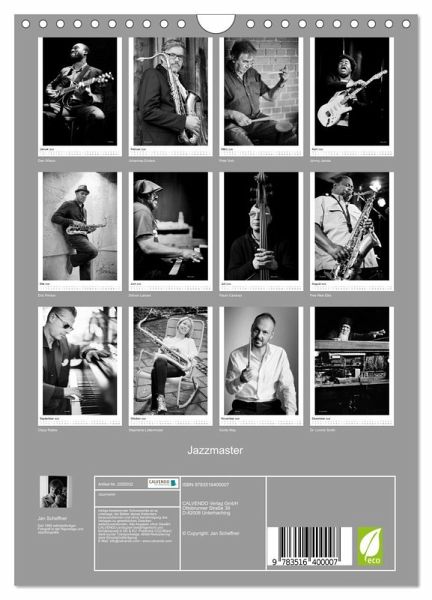 QUALITÄT - Hochwertiger Fotokalender mit 12 wunderschönen Motiven auf lichtbeständigem Bilderdruckpapier, robuste Spiralbindung mit Aufhängebügel.NACHHALTIG - deutliche Abfallreduzierung durch bedarfsgerechte Einzelstückfertigung, umweltfreundliches FSC-zertifiziertes Papier, Produktion in Deutschland, klimabewusste Logistik.PERFEKTES GESCHENK - Kalender für Freunde und Familie, für Kinder und Erwachsene, jung und alt, zu Weihnachten, Geburtstag oder zwischendurch.VIELFALT - Bildkalender in verschiedenen Formaten, z.B. DIN A5, DIN A4, DIN A3 sowie DIN A2. Ob Naturmotiv, Gemälde oder Fotos, ideal für ein persönliches Wohlfühlambiente.Fotografische Eindrücke aus der Welt des Jazz. von Autor(in): Jan Scheffner