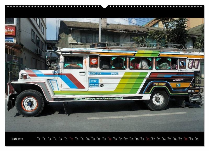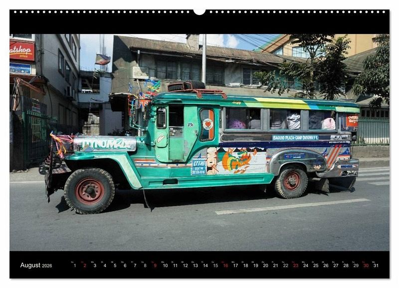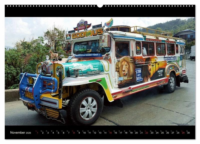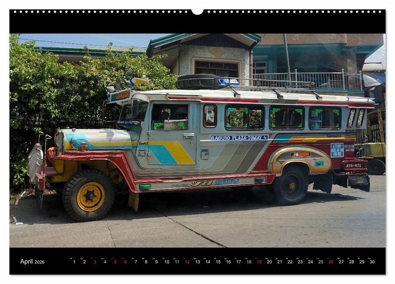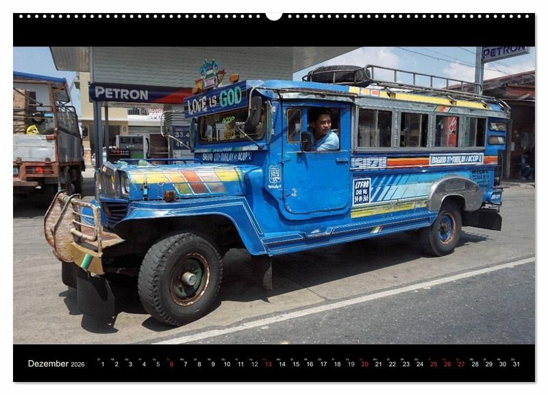 Jeepneys sind auf den Philippinen ein typisches Transportmittel im öffentlichen Nahverkehr. Namensgebender Ursprung waren amerikanische Jeeps, die man zwei Meter länger machte und mit zwei gegenüberstehenden langen Sitzreihen bestuhlte. Die heutigen Jeepneys sind kaum anders als das Original, immer noch von Hand gefertigt, meist aus japanischen Zubehörteilen, und in jeder Hinsicht individuell, was sich nicht zuletzt in der überwiegend bunten Lackierung und bei den Accessoires widerspiegelt. Dieser Kalender zeigt Jeepneys in Baguio, einer Bergstadt in den philippinischen Kordilleren auf der Insel Luzon.