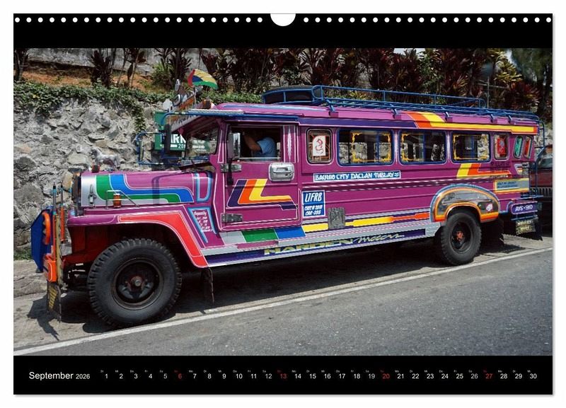 Jeepneys sind auf den Philippinen ein typisches Transportmittel im öffentlichen Nahverkehr. Namensgebender Ursprung waren amerikanische Jeeps, die man zwei Meter länger machte und mit zwei gegenüberstehenden langen Sitzreihen bestuhlte. Die heutigen Jeepneys sind kaum anders als das Original, immer noch von Hand gefertigt, meist aus japanischen Zubehörteilen, und in jeder Hinsicht individuell, was sich nicht zuletzt in der überwiegend bunten Lackierung und bei den Accessoires widerspiegelt. Dieser Kalender zeigt Jeepneys in Baguio, einer Bergstadt in den philippinischen Kordilleren auf der Insel Luzon.