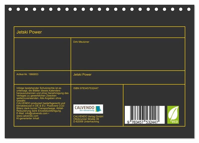 QUALITÄT - Hochwertiger Fotokalender mit 12 wunderschönen Motiven auf lichtbeständigem Bilderdruckpapier, robuste Spiralbindung.NACHHALTIG - deutliche Abfallreduzierung durch bedarfsgerechte Einzelstückfertigung, umweltfreundliches FSC-zertifiziertes Papier, Produktion in Deutschland, klimabewusste Logistik.PERFEKTES GESCHENK - Kalender für Freunde und Familie, für Kinder und Erwachsene, jung und alt, zu Weihnachten, Geburtstag oder zwischendurch.VIELFALT - Bildkalender in verschiedenen Formaten, z.B. DIN A5, DIN A4, DIN A3 sowie DIN A2. Ob Naturmotiv, Gemälde oder Fotos, ideal für ein persönliches Wohlfühlambiente.Der wilde Ritt mit dem Jetski über das Wasser, ein Funsport der besonderen Art. von Autor(in): Dirk Meutzner