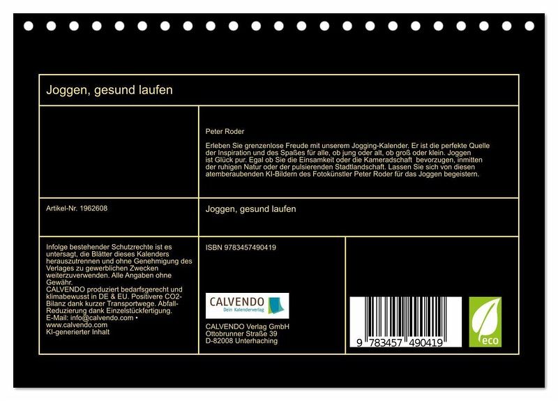 Erleben Sie grenzenlose Freude mit unserem Jogging-Kalender. Er ist die perfekte Quelle der Inspiration und des Spaßes für alle, ob jung oder alt, ob groß oder klein. Joggen ist Glück pur. Egal ob Sie die Einsamkeit oder die Kameradschaft bevorzugen, inmitten der ruhigen Natur oder der pulsierenden Stadtlandschaft. Lassen Sie sich von diesen atemberaubenden KI-Bildern des Fotokünstler Peter Roder für das Joggen begeistern.