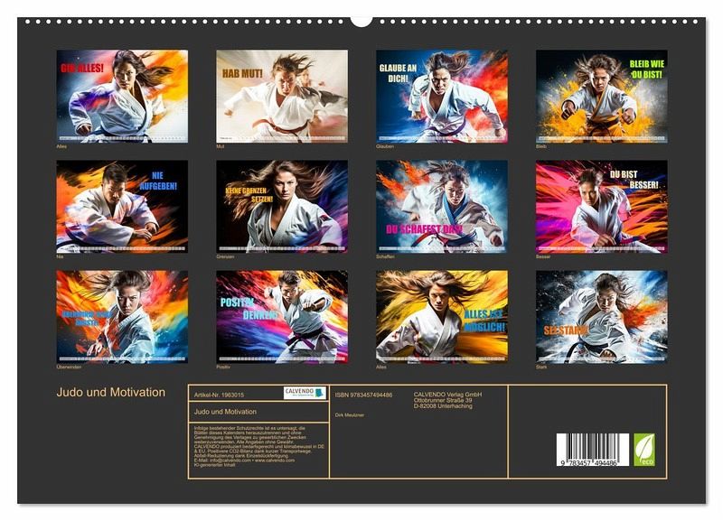 Entdecken Sie unseren einzigartigen Judo und Motivation Wandkalender, das perfekte Geschenk und Mitbringsel für alle Judo-Enthusiasten und Menschen, die nach Inspiration suchen! Jeden Monat wartet eine neue, kraftvolle Botschaft darauf, Sie zu Höchstleistungen im Judo und im Leben anzuspornen. Unser Wandkalender verleiht Ihrem Zuhause, Büro oder Fitnessstudio einen Hauch von Judo-Leidenschaft. Mit hochwertigen Fotos und gestochen scharfem Design sorgt er für eine ansprechende Atmosphäre. Verwandeln Sie Ihr Umfeld in eine Quelle der Motivation und Begeisterung mit unserem Judo und Motivation Wandkalender. Holen Sie sich noch heute Ihren eigenen Kalender oder verschenken Sie ihn an einen Judo-Enthusiasten, um 365 Tage voller Inspiration zu erleben! Erstellt wurden die Bilder mit KI und Photoshop.
