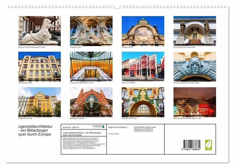 PREMIUM-LINIE - Brillanter Fotokalender mit 12 wunderschönen Motiven, Kunstdruck in Hochglanz in Museumsqualität.QUALITÄT - edle Materialien, stabile Rückwand mit 2 innovativen Einstecktaschen für eine optimale Präsentation an der Wand.NACHHALTIG - deutliche Abfallreduzierung durch bedarfsgerechte Einzelstückfertigung, umweltfreundliches FSC-zertifiziertes Papier, Produktion in Deutschland, klimabewusste Logistik.PERFEKTES GESCHENK - Kalender für Freunde und Familie, für Kinder und Erwachsene, jung und alt, zu Weihnachten, Geburtstag oder zwischendurch.Eine Sammlung von Bildbeispielen europäischer Jugendstilarchitektur von Autor(in): Christian Müller