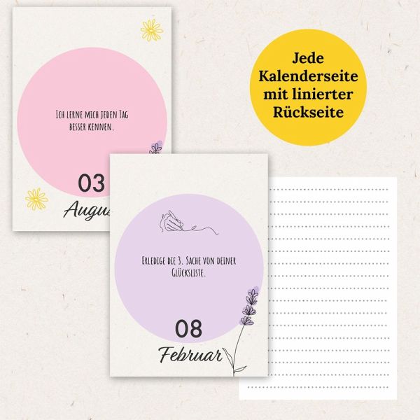 Ob du dich neu ausrichten möchtest, dir selbst wieder näherkommen willst oder endlich den Mut finden möchtest, deine Herzenswünsche umzusetzen. Dieser Kalender unterstützt dich dabei. Er inspiriert dich, dranzubleiben, dich selbst ernst zu nehmen und in kleinen Schritten Großes zu bewegen. Die Affirmationen geben dir Kraft, die Aufgaben bringen dich ins Tun. Zusammen berühren sie Herz undVerstand. Sie erinnern dich daran, wer du bist, und ermutigen dich, loszugehen.