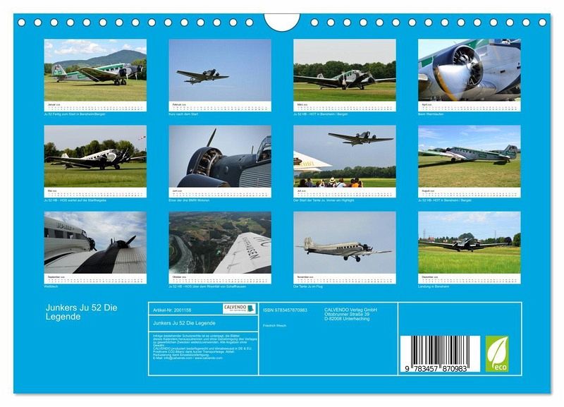 QUALITÄT - Hochwertiger Fotokalender mit 12 wunderschönen Motiven auf lichtbeständigem Bilderdruckpapier, robuste Spiralbindung mit Aufhängebügel.NACHHALTIG - deutliche Abfallreduzierung durch bedarfsgerechte Einzelstückfertigung, umweltfreundliches FSC-zertifiziertes Papier, Produktion in Deutschland, klimabewusste Logistik.PERFEKTES GESCHENK - Kalender für Freunde und Familie, für Kinder und Erwachsene, jung und alt, zu Weihnachten, Geburtstag oder zwischendurch.VIELFALT - Bildkalender in verschiedenen Formaten, z.B. DIN A5, DINA4, DIN A3 sowie DIN A2. Ob Naturmotiv, Gemälde oder Fotos, ideal für ein persönliches Wohlfühlambiente.Impressionen der Junkers Ju 52 - im Volksmund nennt man sie Tante Ju von Autor(in): Friedrich Wesch