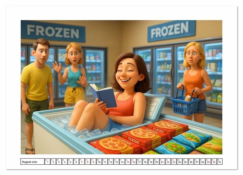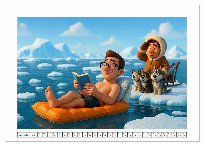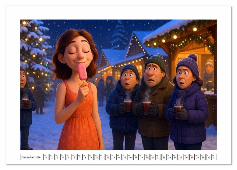 Für alle, die den Kühlschrank für tropisch halten. "Kälteanbeter" ist der etwas andere Kalender für alle, die Schnee lieben, Frost feiern und sich beim ersten Minusgrad endlich lebendig fühlen. Die skurril-schönen Szenen wurden mit Hilfe künstlicher Intelligenz erschaffen - cool, kreativ und garantiert ohne Wärmestau.
