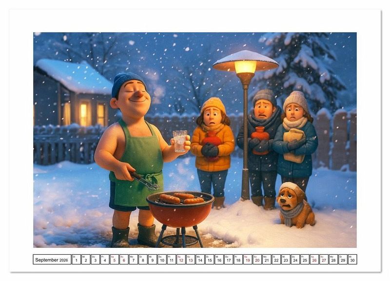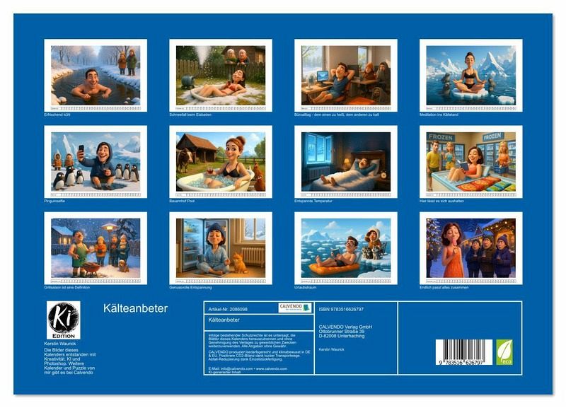 Für alle, die den Kühlschrank für tropisch halten. "Kälteanbeter" ist der etwas andere Kalender für alle, die Schnee lieben, Frost feiern und sich beim ersten Minusgrad endlich lebendig fühlen. Die skurril-schönen Szenen wurden mit Hilfe künstlicher Intelligenz erschaffen - cool, kreativ und garantiert ohne Wärmestau.