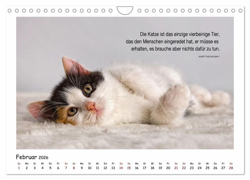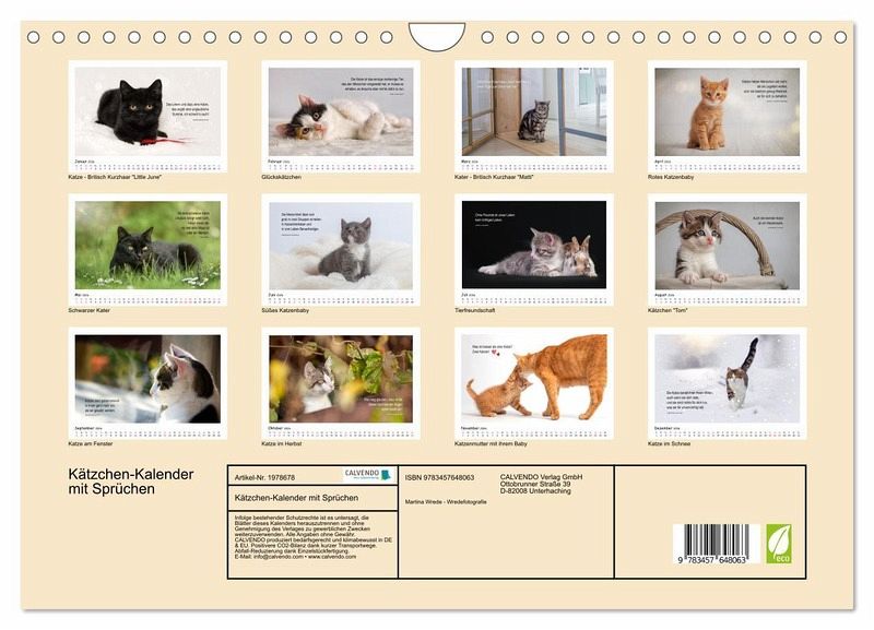 QUALITÄT - Hochwertiger Fotokalender mit 12 wunderschönen Motiven auf lichtbeständigem Bilderdruckpapier, robuste Spiralbindung mit Aufhängebügel.NACHHALTIG - deutliche Abfallreduzierung durch bedarfsgerechte Einzelstückfertigung, umweltfreundliches FSC-zertifiziertes Papier, Produktion in Deutschland, klimabewusste Logistik.PERFEKTES GESCHENK - Kalender für Freunde und Familie, für Kinder und Erwachsene, jung und alt, zu Weihnachten, Geburtstag oder zwischendurch.VIELFALT - Bildkalender in verschiedenen Formaten, z.B. DIN A5, DIN A4, DIN A3 sowie DIN A2. Ob Naturmotiv, Gemälde oder Fotos, ideal für ein persönliches Wohlfühlambiente.Wundervolle Katzenfotografien, kombiniert mit Sprüchen, begleiten Sie durch das Jahr von Autor(in): Martina Wrede
