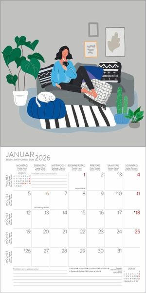 Wandkalender im Format: 30 x 30 cm; Offenes Format: 30 x 60 cm; umweltfreundliches FSC PapierJede Kalenderseite mit großem Bild und viel Platz im Kalendarium für Notizen und TermineMehrsprachiges Kalendarium: DE/GB/FR/IT/ES mit Feiertagen für D/A/CH/GB/FR/IT/ESRegionale Ferienzeiten für DE/A/CHMonatsübersicht für den jeweiligen Vor- und Nachmonat; Jahresübersicht