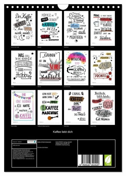 QUALITÄT - Hochwertiger Fotokalender mit 12 wunderschönen Motiven auf lichtbeständigem Bilderdruckpapier, robuste Spiralbindung mit Aufhängebügel.NACHHALTIG - deutliche Abfallreduzierung durch bedarfsgerechte Einzelstückfertigung, umweltfreundliches FSC-zertifiziertes Papier, Produktion in Deutschland, klimabewusste Logistik.PERFEKTES GESCHENK - Kalender für Freunde und Familie, für Kinder und Erwachsene, jung und alt, zu Weihnachten, Geburtstag oder zwischendurch.VIELFALT - Bildkalender in verschiedenen Formaten, z.B. DIN A5, DIN A4, DIN A3 sowie DIN A2. Ob Naturmotiv, Gemälde oder Fotos, ideal für ein persönliches Wohlfühlambiente.Freche Kaffeesprüche im Handlettering-Stil von Autor(in): Christine Brendle-Behnisch Müller