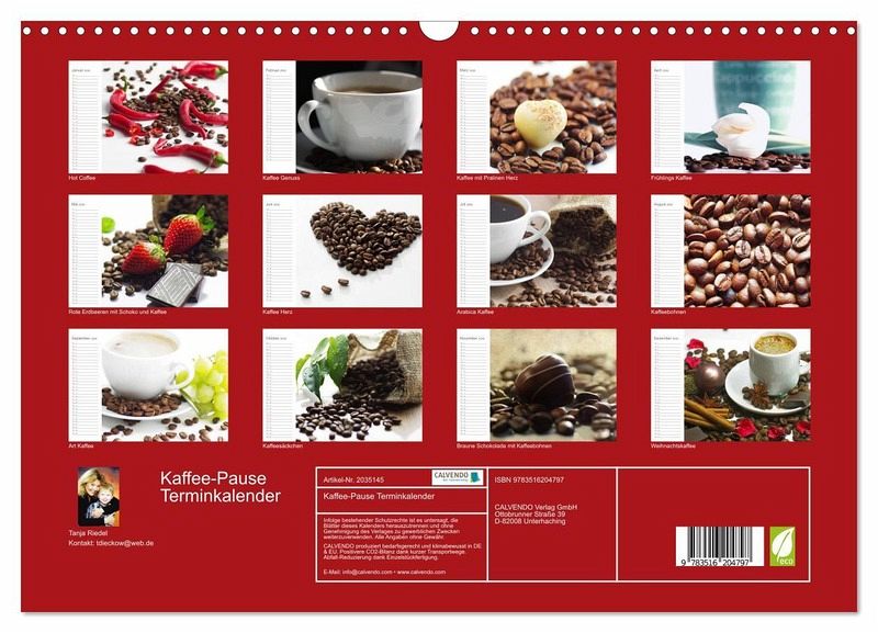 Kaffee steht für einen Wachmacher, für gemütliche Plauderstündchen mit Freunden, oder für die kleine Pause zwischendurch. Kaffee, ob Zuhause, in der Bar, oder bei einem Stück feinem Kuchen, lässt sich nicht mehr wegdenken. Dieser Terminkalender zeigt eindrucksvolle Kaffee-Impressionen für jeden Tag.
