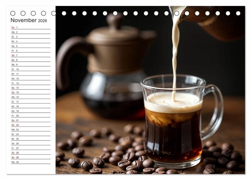 Tauchen Sie ein in die faszinierende Welt der Kaffeezubereitung! Unser exklusiver KI-Kalender nimmt Sie mit auf eine Reise durch 12 Monate voller Kaffeekultur. Jedes Blatt zeigt eindrucksvolle Bilder der verschiedenen Zubereitungsmethoden - von der traditionellen French Press bis hin zum exotischen vietnamesischen drip coffee. Perfekt für Kaffeeliebhaber und Genießer: Lassen Sie sich jeden Monat von neuen Kaffeekreationen inspirieren und lernen Sie mehr über die Handwerkskunst hinter jeder Tasse. Machen Sie Ihre Wände zum Kunstwerk - und Ihre Küche zum Café! Jetzt bestellen und täglich die Liebe zum Kaffee erleben!