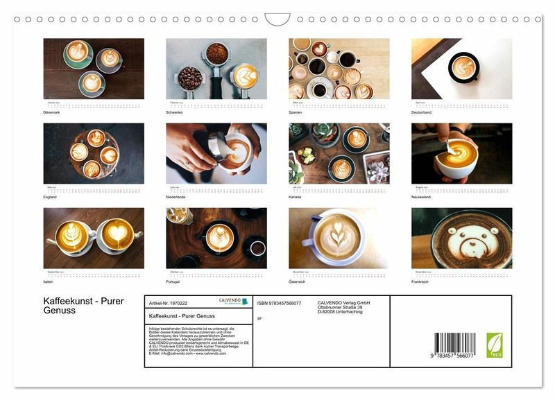 Ein schön verzierter Kaffee lässt viele Herzen höher schlagen und erhöht den Genuss bei jedem Schluck. Dieser Kalender zeigt 12 sorgfältig ausgewählte Motive von beeindruckender Kaffeekunst. Da bekommt man Lust auf eine Tasse.