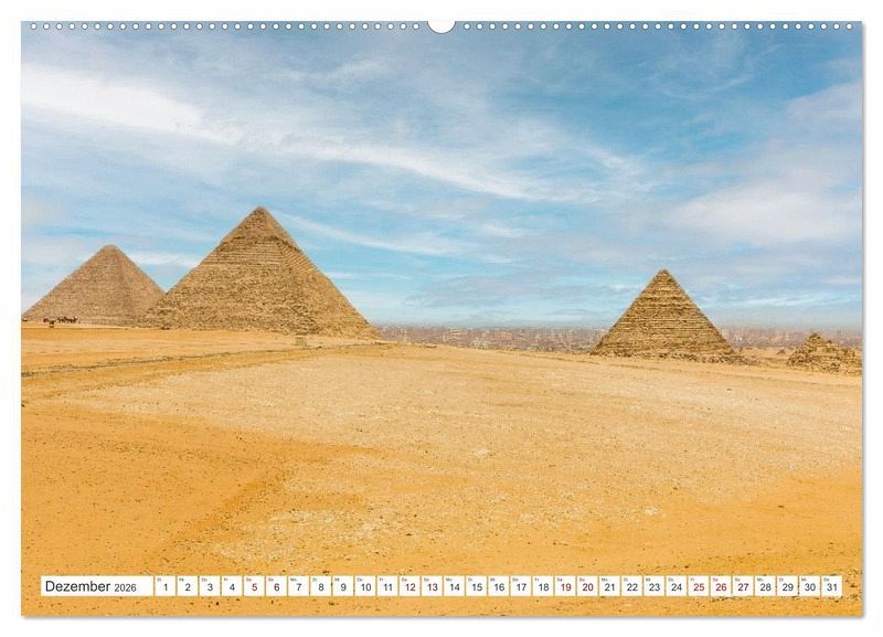 Dezember: Die 3 großen Pyramiden mit Kairo im Hintergrund