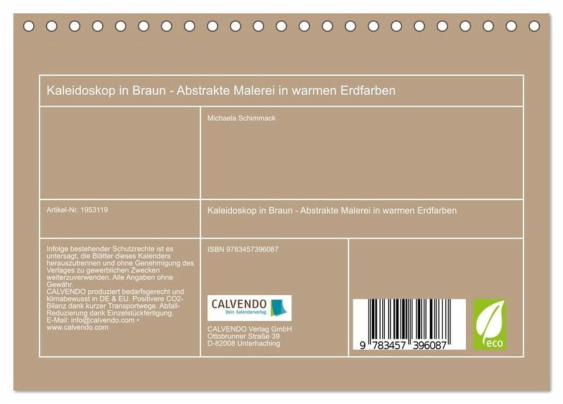 Die Wärme und Vielseitigkeit der Farbe Braun ist in diesem Kalender in abstrakt gemalten Bildern das Motiv. Jeder Monat setzt eine erdige Nuance in Szene und bildet eine stilvolle Akzent in Ihrem Zuhause oder Büro. Lassen Sie sich inspirieren und bringen Sie stilvolle Kunst in Ihren Alltag.