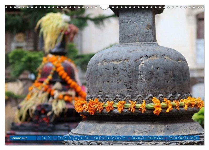 Januar: Steinskulptur geschmückt zum Tihar-Fest