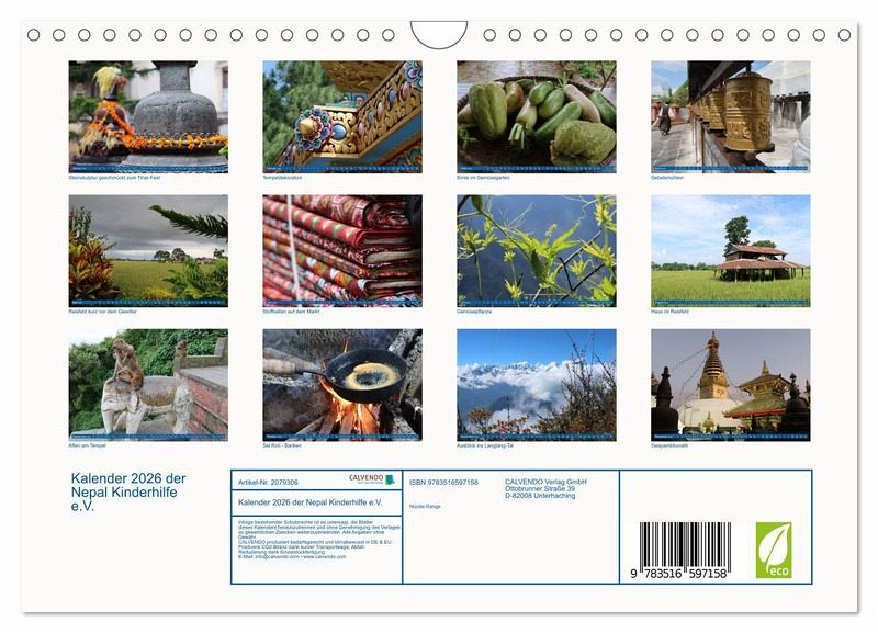 Der Wandkalender der Nepal-Kinderhilfe e.V. gewährt faszinierende Einblicke in das alltägliche Leben Nepals. Mit stimmungsvollen Bildern zeigt er Momente des Erntens, Kochens und Feierns von traditionellen Festen. Darüber hinaus vermittelt er die kulturelle Vielfalt und Herzlichkeit der Menschen und lädt dazu ein, mehr über ihre Lebensweise zu erfahren. Ein Kalender, der nicht nur die Zeit misst, sondern auch Geschichten erzählt.