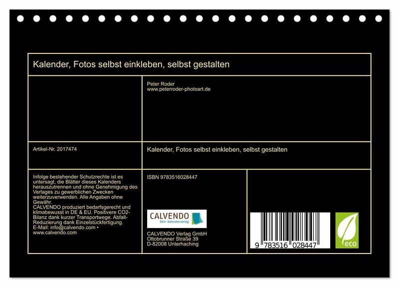 QUALITÄT - HochwertigerFotokalender mit 12 wunderschönen Motiven auf lichtbeständigem Bilderdruckpapier, robuste Spiralbindung.NACHHALTIG - deutliche Abfallreduzierung durch bedarfsgerechte Einzelstückfertigung, umweltfreundliches FSC-zertifiziertes Papier, Produktion in Deutschland, klimabewusste Logistik.PERFEKTES GESCHENK - Kalender für Freunde und Familie, für Kinder und Erwachsene, jung und alt, zu Weihnachten, Geburtstag oder zwischendurch.VIELFALT - Bildkalender in verschiedenen Formaten, z.B. DIN A5, DIN A4, DIN A3 sowie DIN A2. Ob Naturmotiv, Gemälde oder Fotos, ideal für ein persönliches Wohlfühlambiente.Kalender mit zwölf Hintergrundbildern zum selbstgestalten und bekleben. von Autor(in): Peter Roder