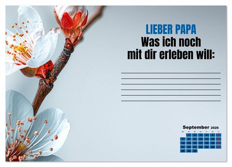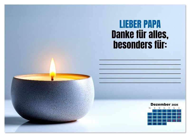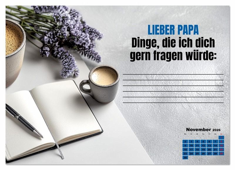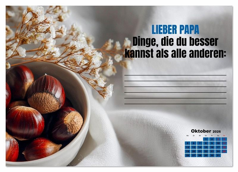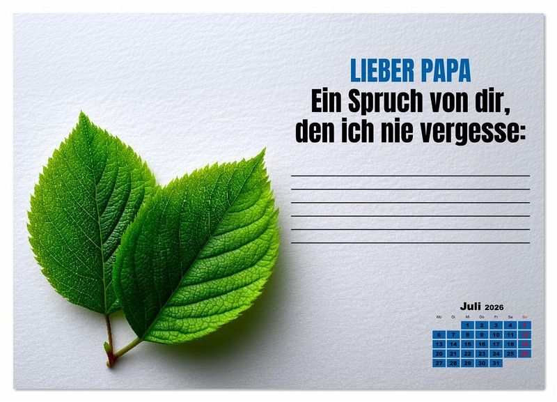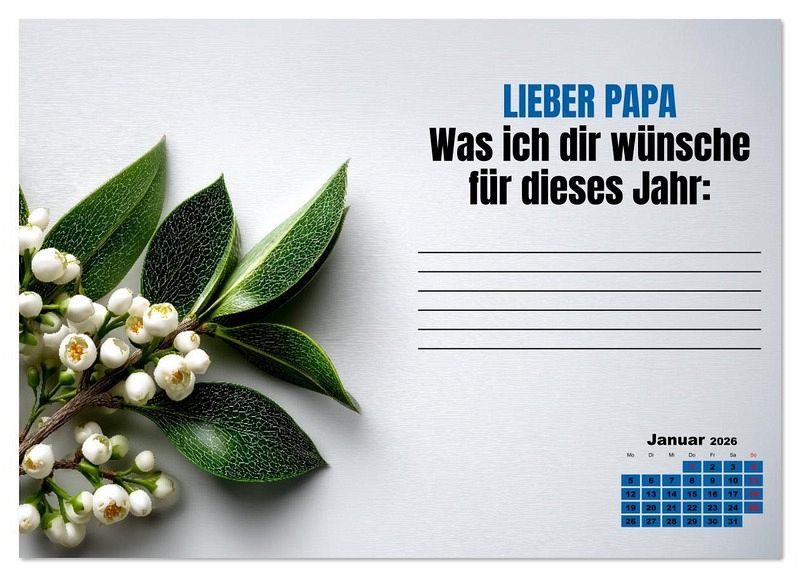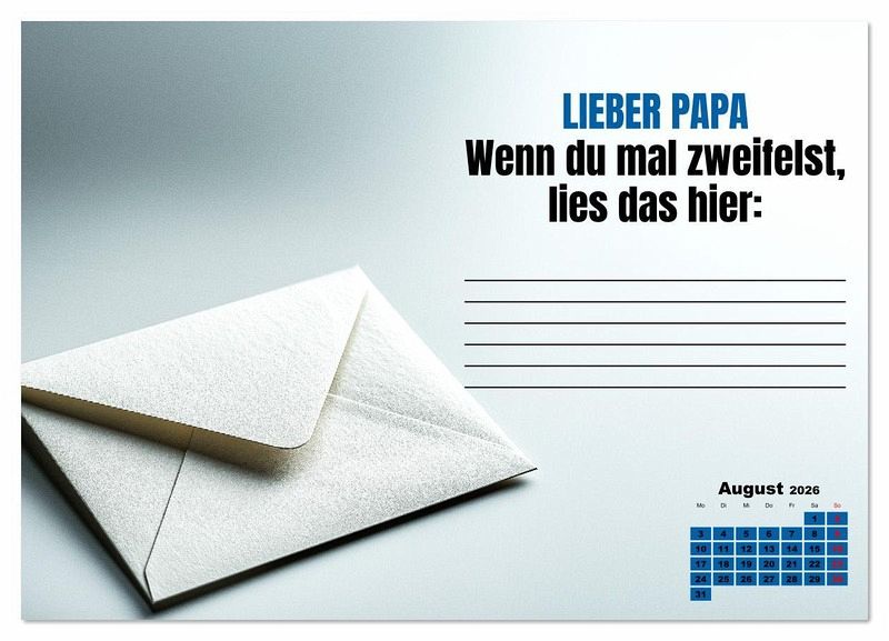 Dieser liebevoll gestaltete Kalender für Papa ist mehr als nur ein Jahreskalender - er ist ein persönliches Geschenk an deinen Papa. Monat für Monat können Erinnerungen, Wünsche und liebevolle Gedanken für den Vater aufgeschrieben werden (Permanentmarker nutzen). Ein Geschenkkalender zum Ausfüllen, der emotional bewegt, individuell gestaltet werden kann und Papa zeigt, wie besonders er ist! Ob als Weihnachtsgeschenk für Papa, als Geschenk für Papa zum Geburtstag oder einfach als Dankeschön - dieser KI-generiert Papakalender ist ein einzigartiges, personalisierbares Geschenk. Er bietet Platz für eigene Worte und DIY-Ideen und wird so zu einem echten individuellen Geschenk für Väter. Ideal für Kinder, die Papa überraschen wollen z.B. als Vatertagsgeschenk.